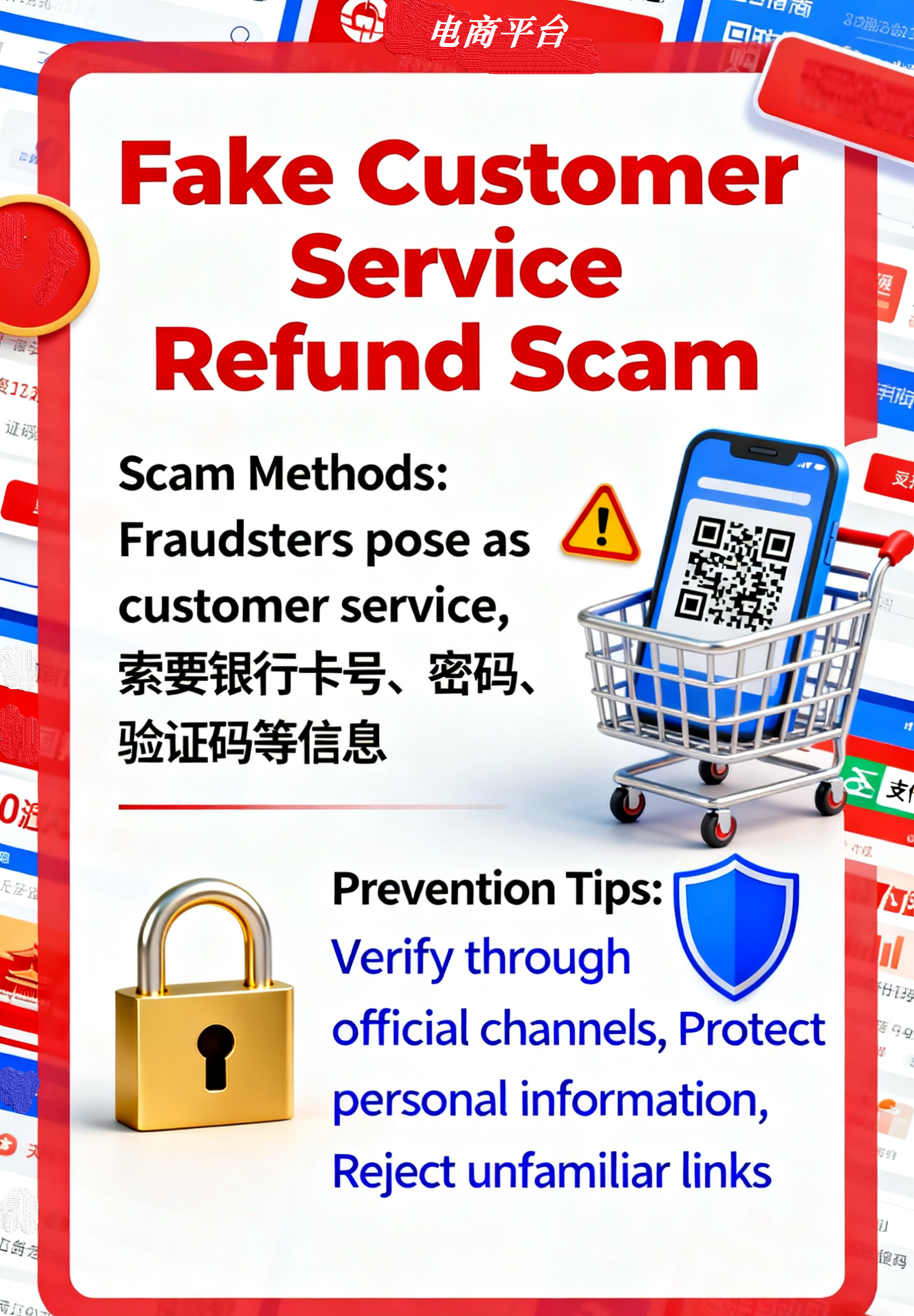 After shopping on an e-commerce platform, consumers receive a phone call or text message from a self proclaimed customer service representative who can accurately provide your order information and claim that there are quality issues or abnormal orders with the product. They proactively request a refund and compensation for you. Subsequently, customer service will guide consumers to click on the "refund link" or scan the QR code. The page that appears to be legitimate is actually forged by fraudsters. The page will require you to fill in your bank card number, mobile phone number, payment password, and especially the crucial SMS verification code. Once submitted, scammers can quickly steal the funds in your account and even use the loan function to put you in debt.