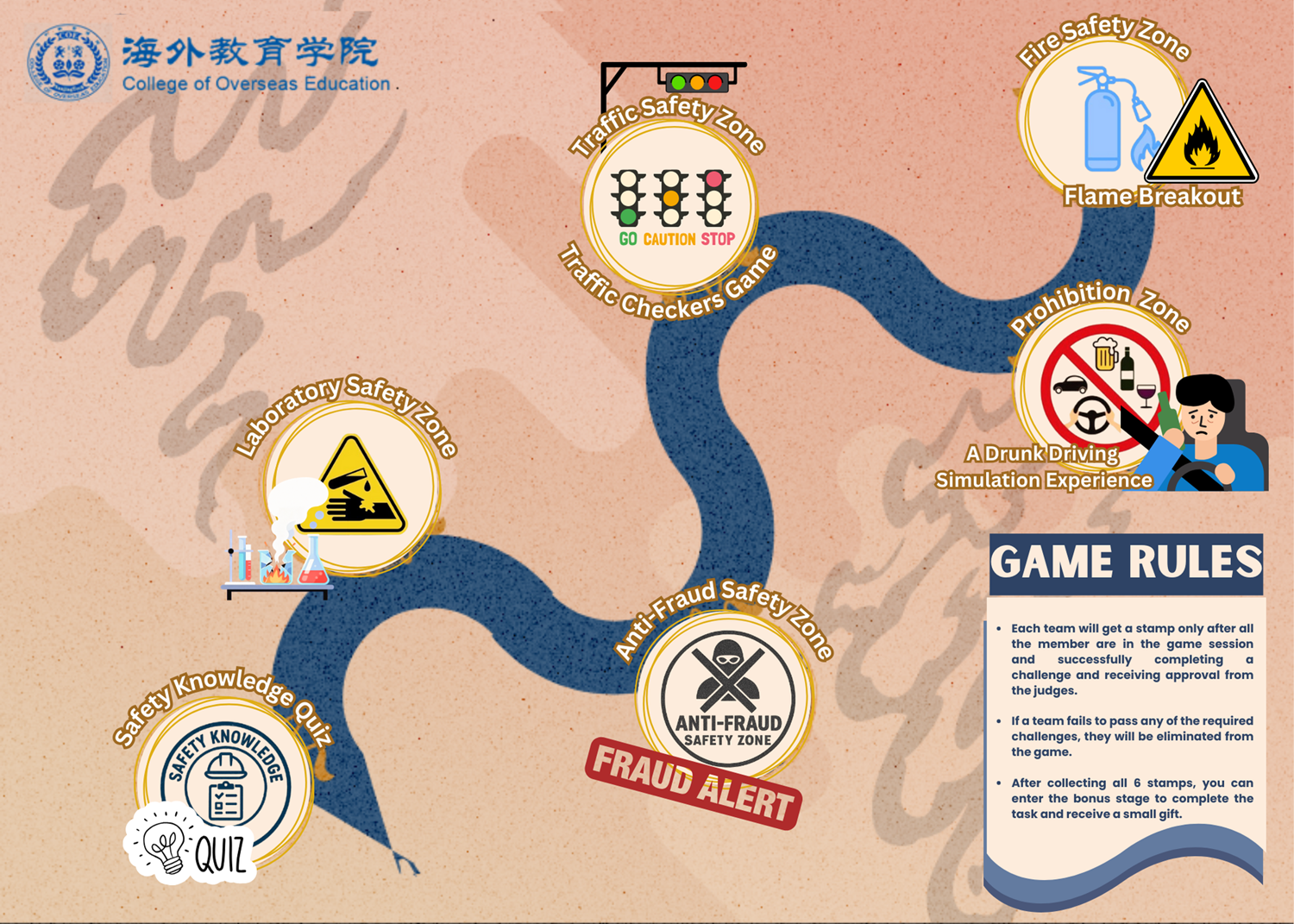 多元互动,闯关中学安全。本次活动创新采用团队闯关记时与集章赛制,设置六大安全主题体验区。为增强活动趣味与纪念意义,学院特别设计了专属集章卡,并精心制作了带有学校与学院标识、校训的系列主题印章。每支队伍需协作通过全部关卡并集齐通关印章,最终依据团队总用时进行排名。活动设计秉持“寓教于乐、知行合一”的理念,将安全知识系统融入情景体验,涵盖生活安全、实验室安全、防范诈骗、交通安全、消防安全及酒驾警示等领域,全面覆盖留学生在华学习生活中常见的安全风险点,着力提升其风险辨识与应对能力。