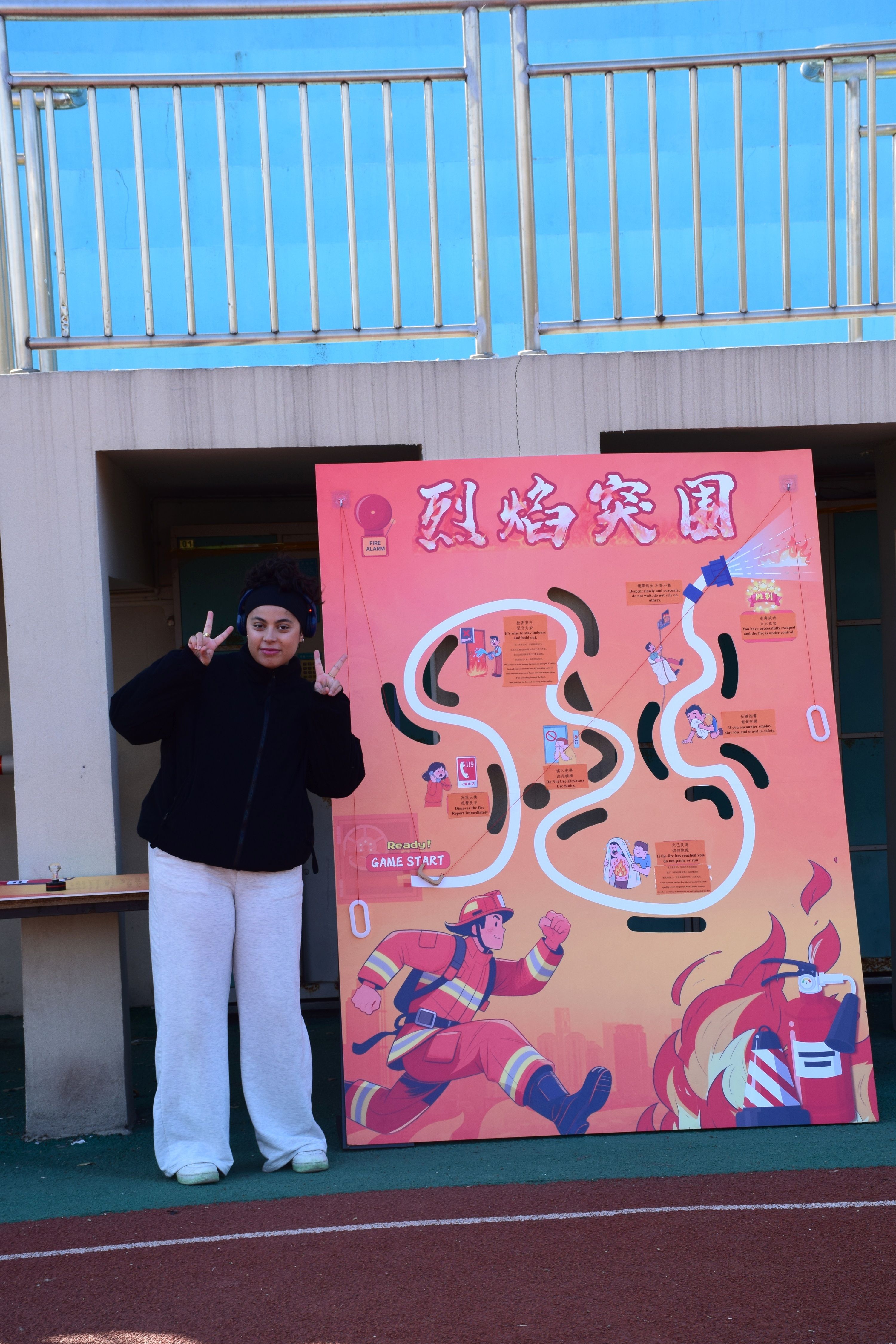 体验式教育,寓教于乐。活动现场气氛热烈有序,中外学生混合编队,在协作闯关中积极互动。安全知识抢答环节紧张激烈,各队争相展现扎实的知识储备;防诈安全区内,团队每完成一组套圈,都需解释出展板上对应的诈骗类型,身旁的中国队友即时补充讲解,将防诈知识融入互动体验;不远处,交通飞行棋区域欢笑声阵阵,中外学生在掷骰前进中认真阅读棋盘上的安全提示,在游戏中深化对交通规则的理解;酒驾模拟区前排起了长队,各参赛人员转完12圈后,摇摇晃晃地试图跑直线,却不由自主地歪向一边,学生们在眩晕中切身体会到了安全驾驶的重要性。而烈焰突围游戏则考验着团队协作,塞拉利昂学生吴达尔与队友们屏息配合,在操控小球穿过复杂轨道的过程了解火灾原因与急救方法、感悟应急处置中的冷静与默契。