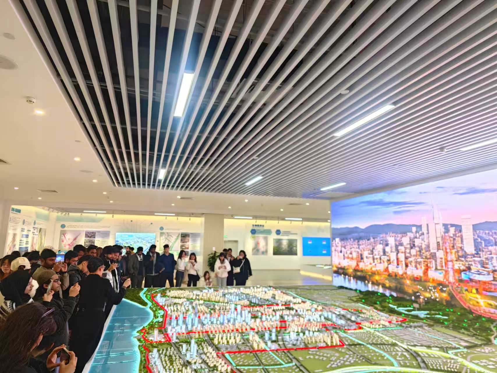 留学生团队首先抵达江北新区规划展览馆。通过讲解员的精彩介绍,以及馆内多媒体演示、实物模型和图文等,留学生们系统了解了江北新区的规划布局、产业发展蓝图及生态建设成果。从科技创新园区到交通枢纽规划,从生态宜居城区到对外开放平台,规划馆全方位的展示让留学生们直观感受到新区的蓬勃发展态势,不时驻足询问相关情况,对新区的建设蓝图充满向往。
